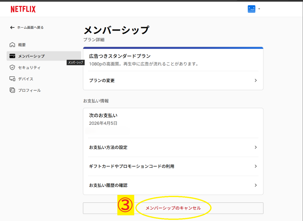 ③「メンバーシップのキャンセル」をクリック